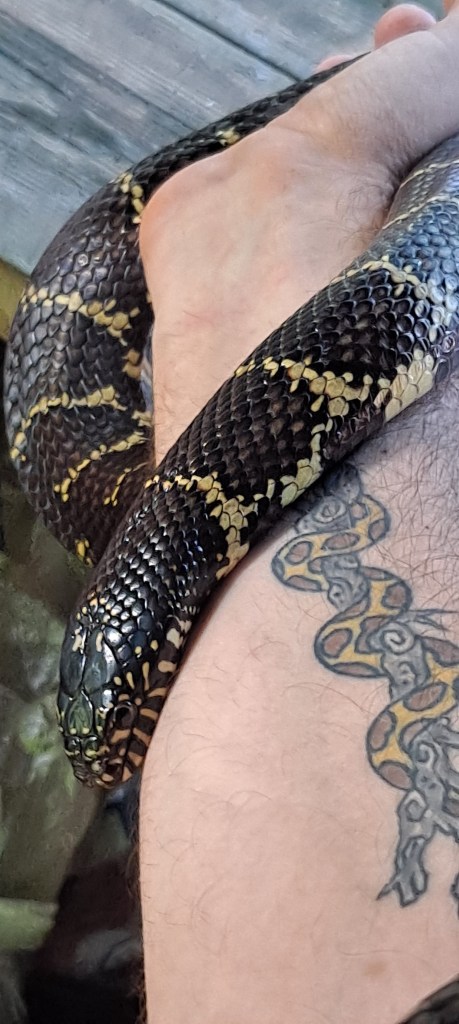 Pasamos a mi parte favorita; el taller de serpientes. Mientras que mis compañeros sostuvieron una pogona y una serpiente del maiz, a mi me tocó con una serpiente rey bien alimentada y grandota, la cual no de quedaba quieta ni a tiros. El tema consistia en hablar a los niños de los reptiles y dejarles que los cogieran